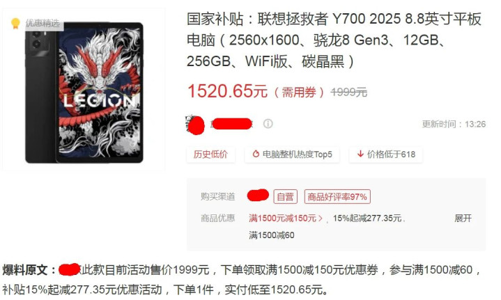 当时我还在评论区说联想拯救者Y700三代就是取消了TF卡,所以二手保值率不如1/2/4代。而今天下午,我看张大妈爆料了Y700三代的低价(不算历史最低,但也还行),狗东原价1999的Y700,通过一系列操作最后实付1520.65元,额外赠送1年延保,晒单还送原装保护套。